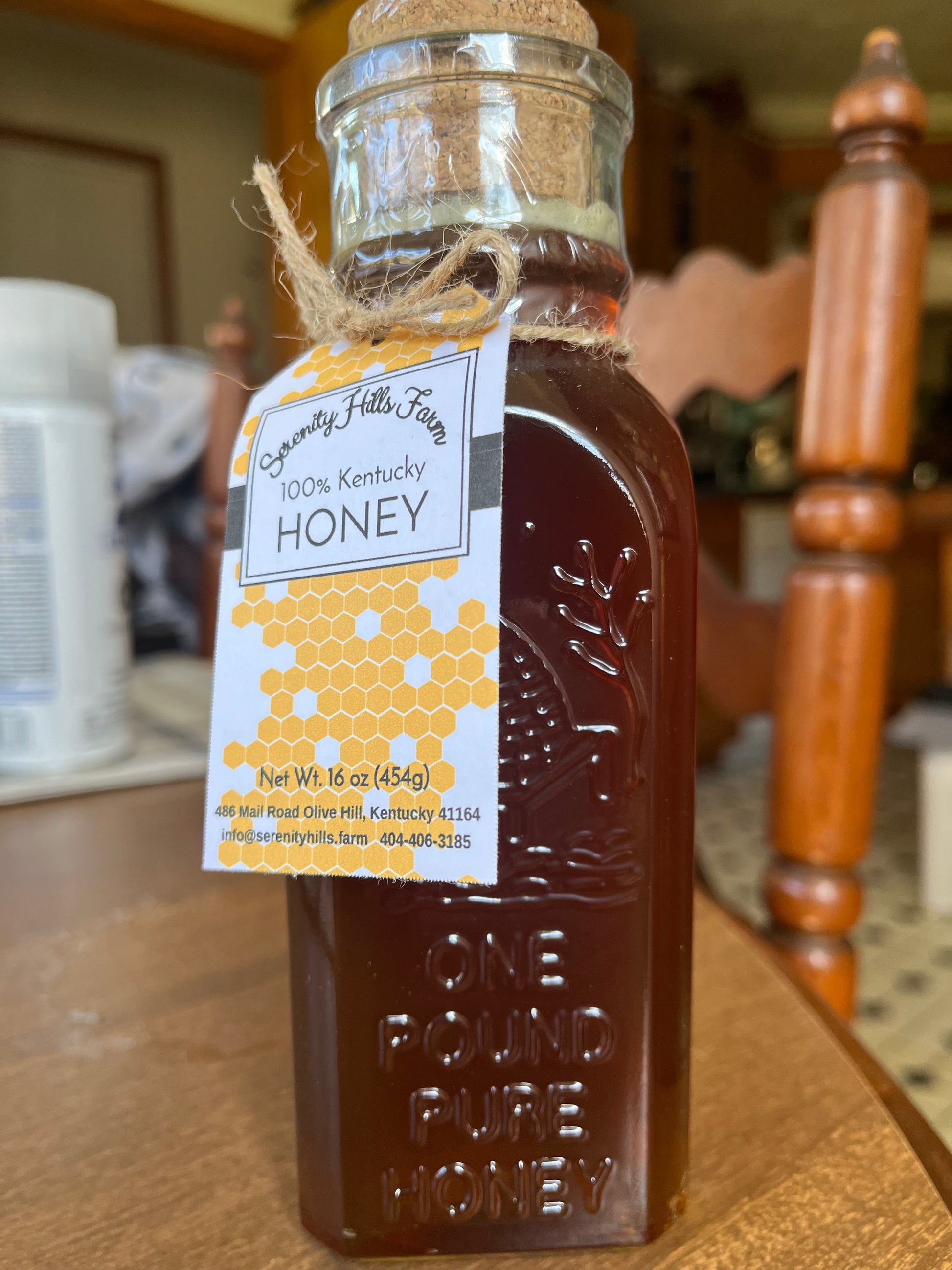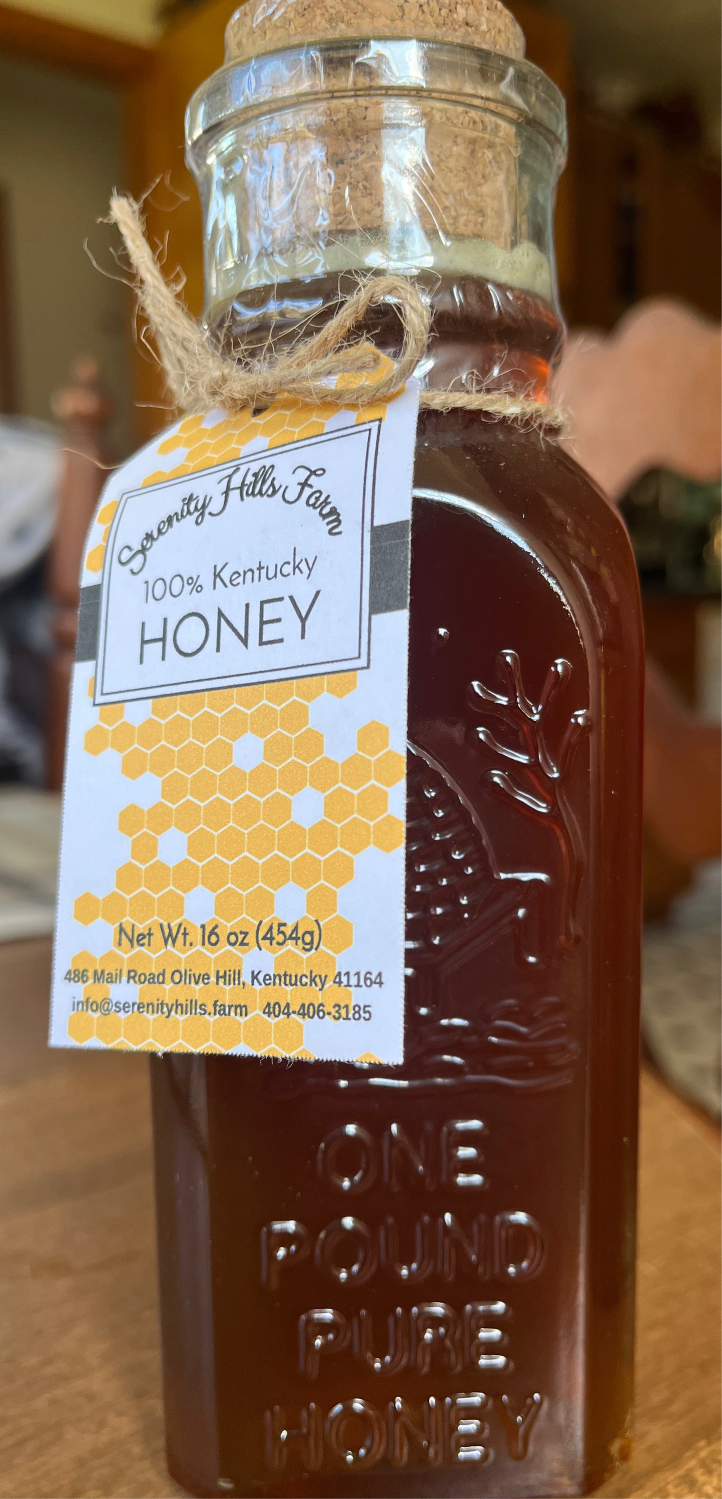 Our farm fresh honey, raw, 100% Kentucky, made by our very own Serenity Bees in a decorative 1lb glass jar with a cork closure. This product is seasonal and limited quantity.