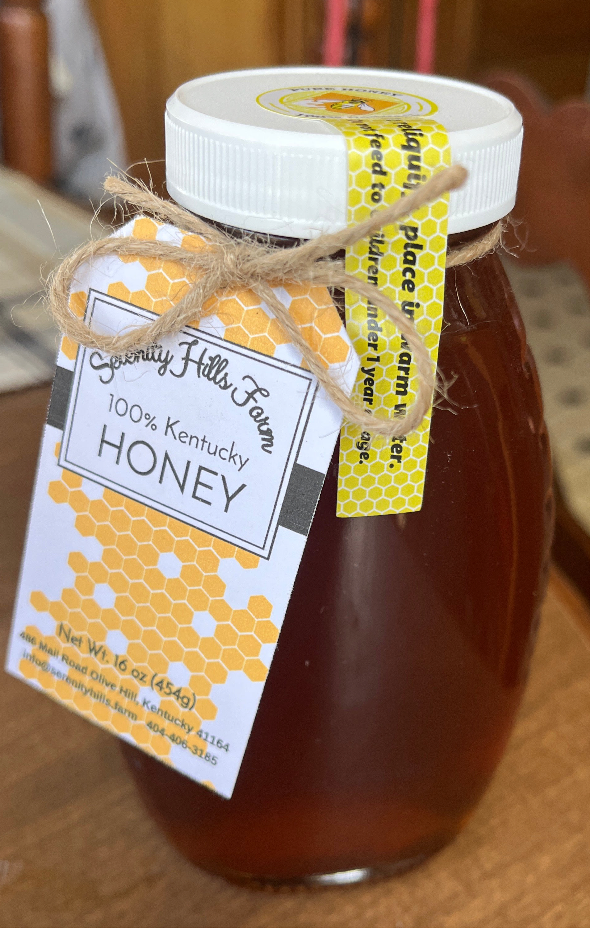 Our farm fresh honey, raw and 100% Kentucky, made by our very own Serenity Bees in a 16oz decorative glass jar. This product is seasonal and very limited quantity. We call this the state fair jar as it is the required jar for the ky state fair honey entries we compete in.
