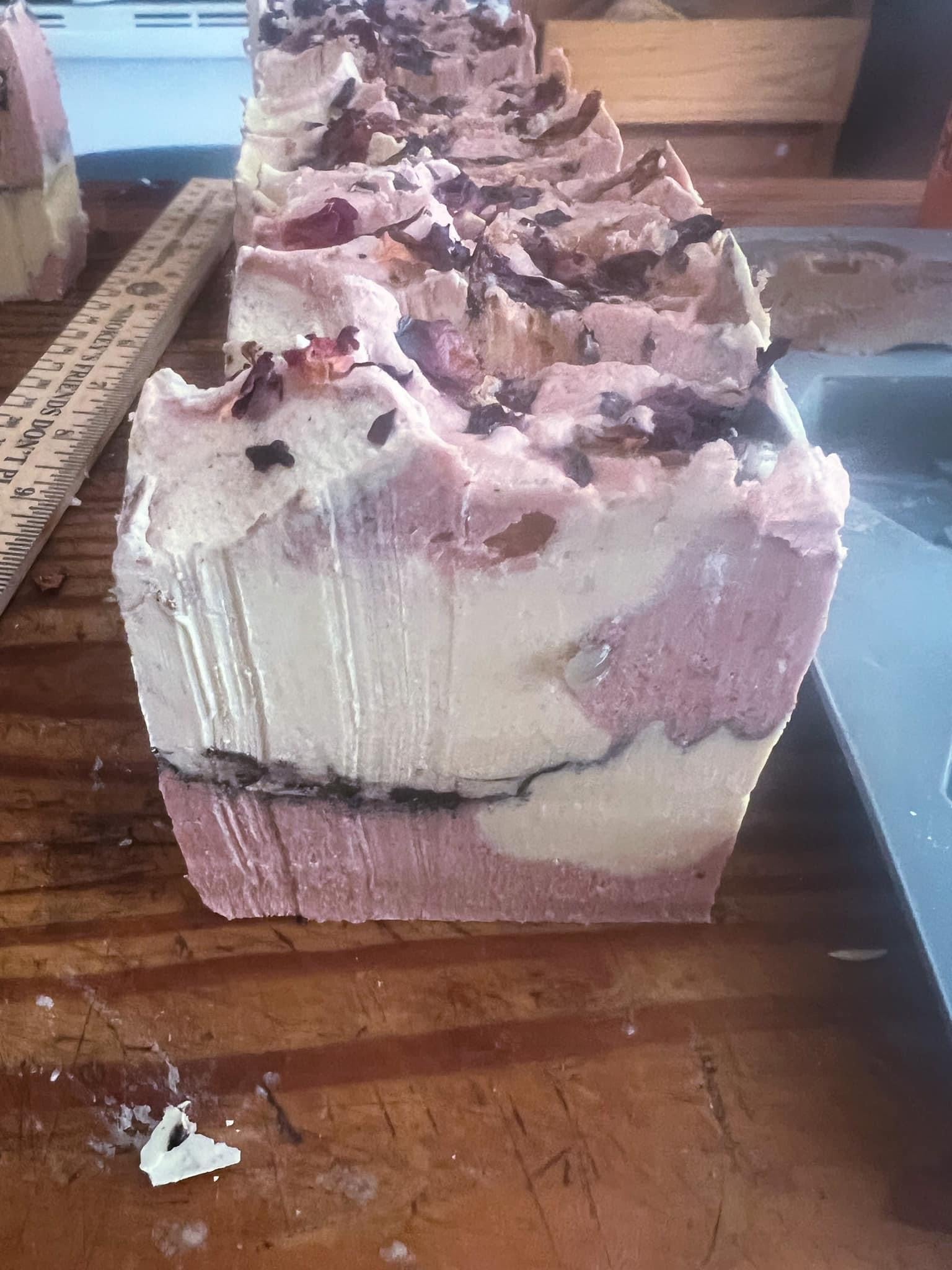 Ingredients: Goats Milk, Coconut Oil, Olive Oil, Palm Oil, Shea butter, almond oil, castor oil, lye, oatmeal, wild rose scent, rose clay, bergamot clay powder, Bees wax